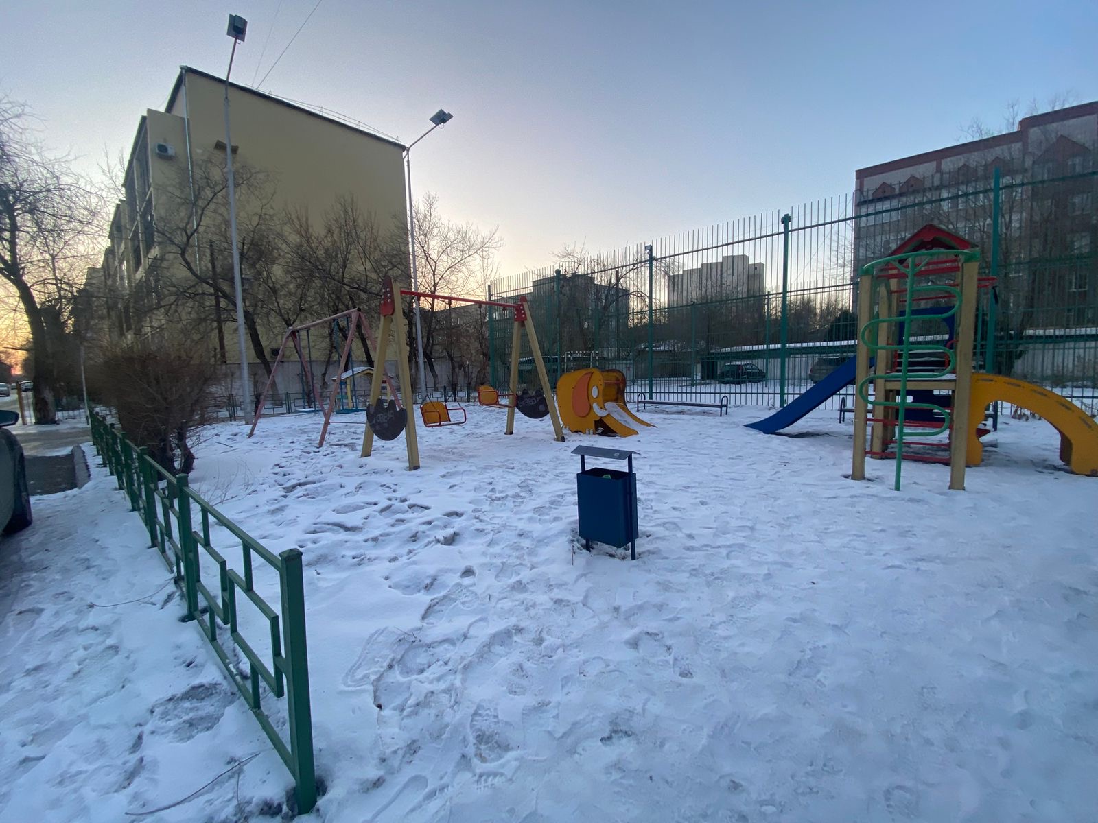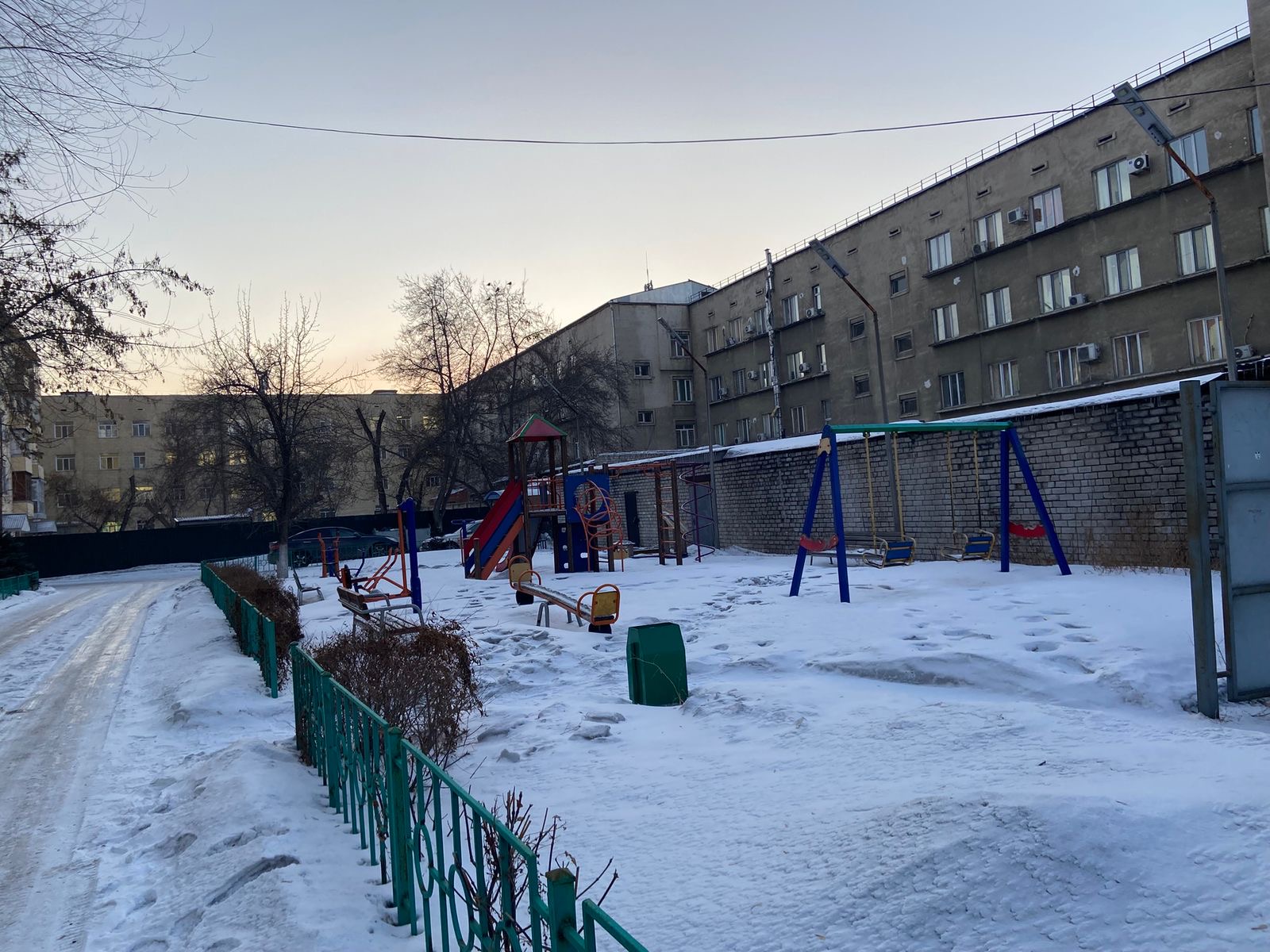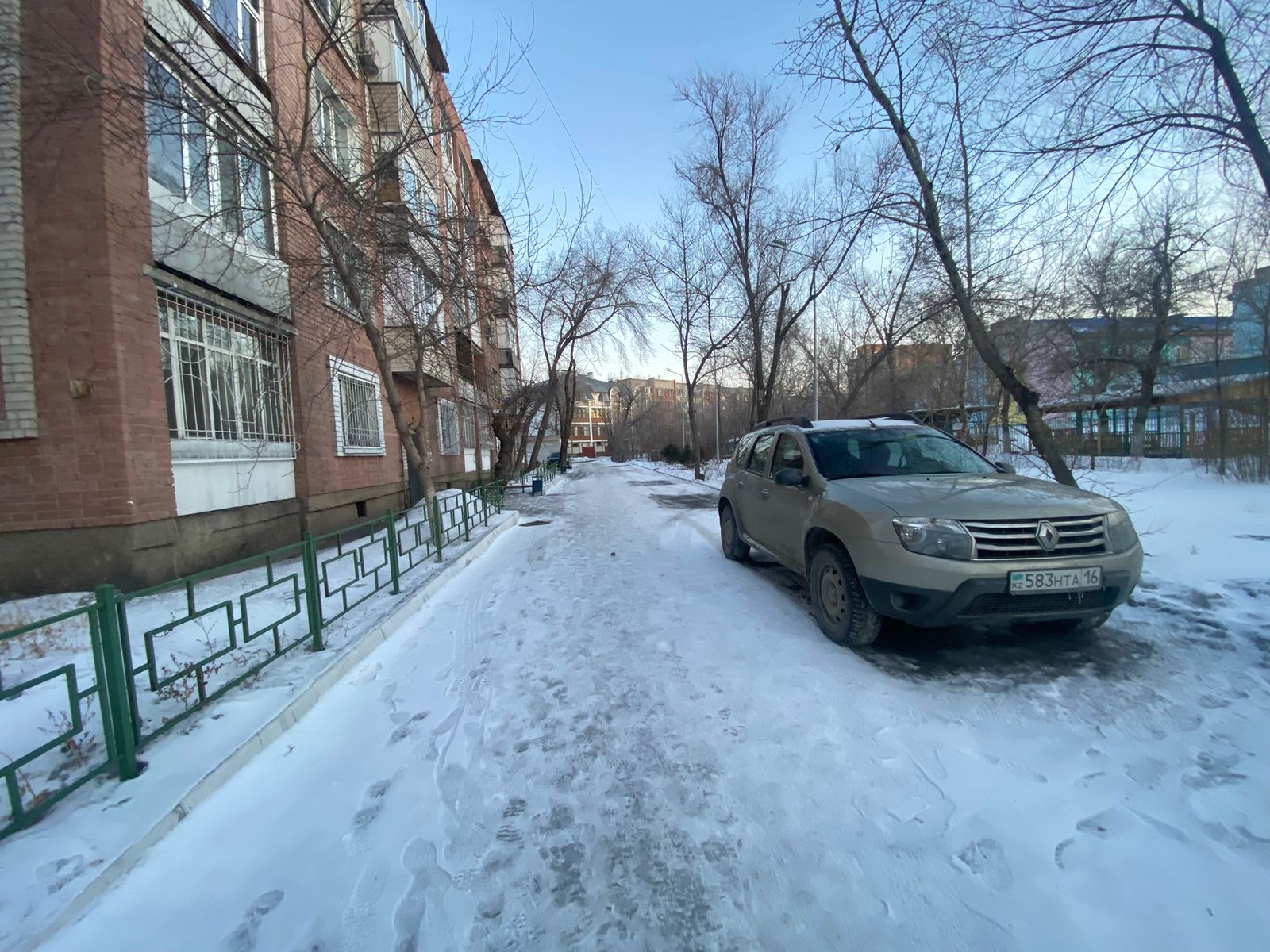Алдымен Ибраев көшесі, 129 мекенжайындағы аулаға бардық. Мұнда қар уақытылы шығарылған, аула аумағы таза. Балалар алаңы мен спорт алаңы да қардан тазартылған.