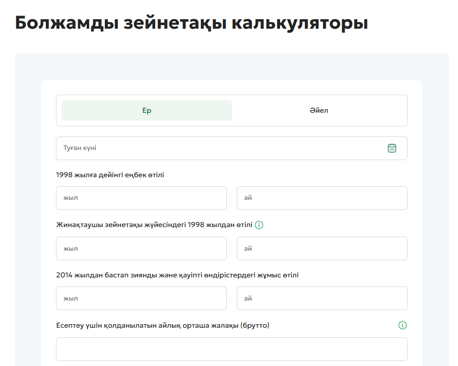 Есептеу үшін туған күн, еңбек өтілі, жалақы мөлшері, қазіргі жинақ сомасы және жарна аудару жиілігі туралы мәліметтер қажет. Ал жеке кабинет арқылы кірген жағдайда деректердің бір бөлігі автоматты түрде толтырылады, бұл есептеу процесін жеңілдетеді.